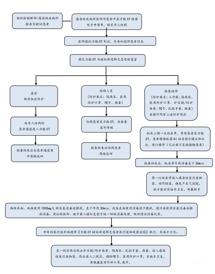 除X線電離防護外,方艙CT檢查需對操作技師、患者及家屬做相應的防護。根據國家衛生健康委辦公廳印發的《新型冠狀病毒肺炎防控方案》(第五版)[6]對于在新型冠狀病毒感染的肺炎疫情防控工作中不同的工作人員其防護等級是不同的。如是疑似患者,技師則執行二級防護。方艙CT內,設置清潔區、一脫區、二脫區、免洗手消毒液、一次性防護服、一次性乳膠手套、鞋套、洗手液。技師需經多次反復訓練穿脫流程和檢查流程,并做好總結,考察合格方可上崗。為此我科花費了大量時間進行了防護用品穿脫,消殺,接診流程的演練,并做總結和改進措施。(附件1所示),防護用品穿脫流程如圖2所示。