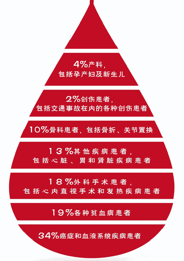 也就是大家獻(xiàn)的血經(jīng)過(guò)分離檢驗(yàn)存儲(chǔ)后送到各大醫(yī)療機(jī)構(gòu)用來(lái)對(duì)有需要輸血的病人輸血救治。其實(shí)我們很多人有個(gè)認(rèn)識(shí)誤區(qū),以為血液就是在災(zāi)難時(shí)候才需要獻(xiàn)血,其實(shí)醫(yī)院每天有不少病人需要各種血液成分來(lái)?yè)尵戎委煛4罅渴а牟∪耍鈧蟪鲅笮褪中g(shù)跟其他原因低血量,輸血來(lái)補(bǔ)充血液,血液大部分用于癌癥跟血液疾病的病人。慢性失血、紅細(xì)胞被破壞或白蛋白合成不足。如血友病、血小板減少癥或血小板功能障礙。凝血異常導(dǎo)致失血,具體來(lái)講血液有個(gè)使用比例數(shù)據(jù)。有助于挽救生命延長(zhǎng)生命提高生活質(zhì)量。