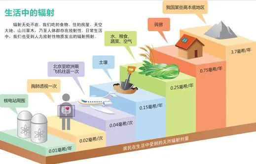 核電站醫院的放射科有電離輻射,我們生活中也有輻射。全世界的人的本底輻射劑量是2.4mSv/人,本底輻射:宇宙射線、天然放射性核素發出的射線、宇宙射線的強度隨海拔高度的增加而增大,高原地區的人群受到的宇宙射線照射劑量比平原地區的人群高,宇宙射線的強度在對流層上大約10公里處最強。需要我們指出的是:適當的天然有效照射對人體是有益的。
